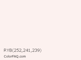 RYB 252,241,239 Color is a almost white red color and the nearest color is Fantasy #faf3f0. Hex code #fcf1ef and RGB value is rgb(252,241,239). In RGB color space, this color is composed of 99% red, 95% green, 94% blue, In CMYK color space, this color is composed of 0% cyan, 4% magenta, 5% yellow , 1% black , In HSL color space, this color has a hue angle of 9° , 68% saturation and 96% lightness.