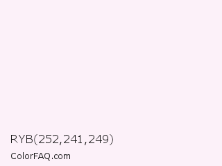 RYB 252,241,249 Color is a almost white magenta color and the nearest color is Tutu #fff1f9. Hex code #fcf1f9 and RGB value is rgb(252,241,249). In RGB color space, this color is composed of 99% red, 95% green, 98% blue, In CMYK color space, this color is composed of 0% cyan, 4% magenta, 1% yellow , 1% black , In HSL color space, this color has a hue angle of 316° , 65% saturation and 97% lightness.
