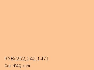 RYB 252,242,147 Color is a light orange color and the nearest color is Peach Orange #ffcc99. Hex code #fcc593 and RGB value is rgb(252,197,147). In RGB color space, this color is composed of 99% red, 77% green, 58% blue, In CMYK color space, this color is composed of 0% cyan, 22% magenta, 42% yellow , 1% black , In HSL color space, this color has a hue angle of 29° , 95% saturation and 78% lightness.