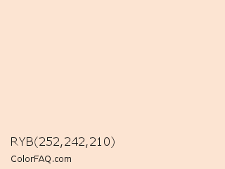 RYB 252,242,210 Color is a very light orange color and the nearest color is Lumber #ffe4cd. Hex code #fce4d2 and RGB value is rgb(252,228,210). In RGB color space, this color is composed of 99% red, 89% green, 82% blue, In CMYK color space, this color is composed of 0% cyan, 10% magenta, 17% yellow , 1% black , In HSL color space, this color has a hue angle of 26° , 88% saturation and 91% lightness.