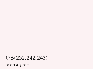 RYB 252,242,243 Color is a almost white red color and the nearest color is Chablis #fff4f3. Hex code #fcf2f3 and RGB value is rgb(252,242,243). In RGB color space, this color is composed of 99% red, 95% green, 95% blue, In CMYK color space, this color is composed of 0% cyan, 4% magenta, 4% yellow , 1% black , In HSL color space, this color has a hue angle of 354° , 63% saturation and 97% lightness.