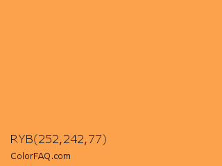 RYB 252,242,77 Color is a light orange color and the nearest color is Neon Carrot #ffa343. Hex code #fca24d and RGB value is rgb(252,162,77). In RGB color space, this color is composed of 99% red, 64% green, 30% blue, In CMYK color space, this color is composed of 0% cyan, 36% magenta, 69% yellow , 1% black , In HSL color space, this color has a hue angle of 29° , 97% saturation and 65% lightness.