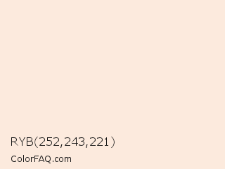 RYB 252,243,221 Color is a very light orange color and the nearest color is Moccasin #faebd7. Hex code #fceadd and RGB value is rgb(252,234,221). In RGB color space, this color is composed of 99% red, 92% green, 87% blue, In CMYK color space, this color is composed of 0% cyan, 7% magenta, 12% yellow , 1% black , In HSL color space, this color has a hue angle of 25° , 84% saturation and 93% lightness.