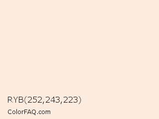 RYB 252,243,223 Color is a very light orange color and the nearest color is Peach Cream #fff0db. Hex code #fcebdf and RGB value is rgb(252,235,223). In RGB color space, this color is composed of 99% red, 92% green, 87% blue, In CMYK color space, this color is composed of 0% cyan, 7% magenta, 12% yellow , 1% black , In HSL color space, this color has a hue angle of 25° , 83% saturation and 93% lightness.