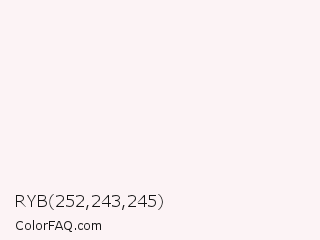 RYB 252,243,245 Color is a almost white red color and the nearest color is Wisp Pink #fef4f8. Hex code #fcf3f5 and RGB value is rgb(252,243,245). In RGB color space, this color is composed of 99% red, 95% green, 96% blue, In CMYK color space, this color is composed of 0% cyan, 4% magenta, 3% yellow , 1% black , In HSL color space, this color has a hue angle of 347° , 60% saturation and 97% lightness.