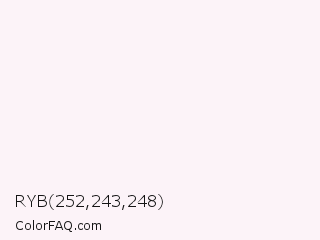 RYB 252,243,248 Color is a almost white magenta color and the nearest color is Wisp Pink #fef4f8. Hex code #fcf3f8 and RGB value is rgb(252,243,248). In RGB color space, this color is composed of 99% red, 95% green, 97% blue, In CMYK color space, this color is composed of 0% cyan, 4% magenta, 2% yellow , 1% black , In HSL color space, this color has a hue angle of 327° , 60% saturation and 97% lightness.