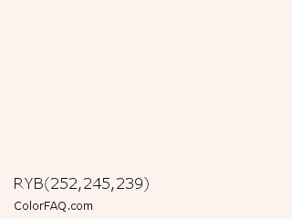 RYB 252,245,239 Color is a almost white orange color and the nearest color is Fantasy #faf3f0. Hex code #fcf3ef and RGB value is rgb(252,243,239). In RGB color space, this color is composed of 99% red, 95% green, 94% blue, In CMYK color space, this color is composed of 0% cyan, 4% magenta, 5% yellow , 1% black , In HSL color space, this color has a hue angle of 18° , 68% saturation and 96% lightness.