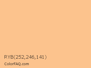 RYB 252,246,141 Color is a light orange color and the nearest color is Macaroni And Cheese #ffbd88. Hex code #fcc38d and RGB value is rgb(252,195,141). In RGB color space, this color is composed of 99% red, 76% green, 55% blue, In CMYK color space, this color is composed of 0% cyan, 23% magenta, 44% yellow , 1% black , In HSL color space, this color has a hue angle of 29° , 95% saturation and 77% lightness.