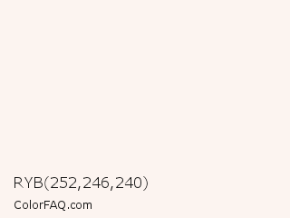 RYB 252,246,240 Color is a almost white orange color and the nearest color is Fantasy #faf3f0. Hex code #fcf4f0 and RGB value is rgb(252,244,240). In RGB color space, this color is composed of 99% red, 96% green, 94% blue, In CMYK color space, this color is composed of 0% cyan, 3% magenta, 5% yellow , 1% black , In HSL color space, this color has a hue angle of 20° , 67% saturation and 96% lightness.