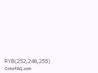 RYB 252,248,255 Color is a almost white purple color and the nearest color is White Pointer #fef8ff. Hex code #fcf8ff and RGB value is rgb(252,248,255). In RGB color space, this color is composed of 99% red, 97% green, 100% blue, In CMYK color space, this color is composed of 1% cyan, 3% magenta, 0% yellow , 0% black , In HSL color space, this color has a hue angle of 274° , 100% saturation and 99% lightness.