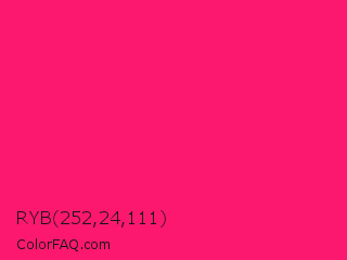 RYB 252,24,111 Color is a normal rose color and the nearest color is Vivid Raspberry #ff006c. Hex code #fc186f and RGB value is rgb(252,24,111). In RGB color space, this color is composed of 99% red, 9% green, 44% blue, In CMYK color space, this color is composed of 0% cyan, 90% magenta, 56% yellow , 1% black , In HSL color space, this color has a hue angle of 337° , 97% saturation and 54% lightness.