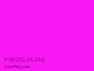 RYB 252,24,244 Color is a normal magenta color and the nearest color is Magenta / Fuchsia #ff00ff. Hex code #fc18f4 and RGB value is rgb(252,24,244). In RGB color space, this color is composed of 99% red, 9% green, 96% blue, In CMYK color space, this color is composed of 0% cyan, 90% magenta, 3% yellow , 1% black , In HSL color space, this color has a hue angle of 302° , 97% saturation and 54% lightness.