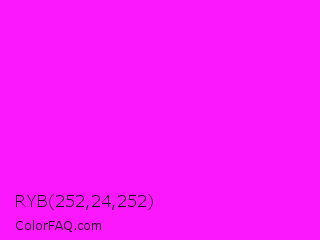 RYB 252,24,252 Color is a normal magenta color and the nearest color is Magenta / Fuchsia #ff00ff. Hex code #fc18fc and RGB value is rgb(252,24,252). In RGB color space, this color is composed of 99% red, 9% green, 99% blue, In CMYK color space, this color is composed of 0% cyan, 90% magenta, 0% yellow , 1% black , In HSL color space, this color has a hue angle of 300° , 97% saturation and 54% lightness.