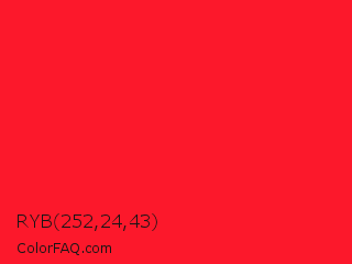 RYB 252,24,43 Color is a normal red color and the nearest color is Torch Red #fd0e35. Hex code #fc182b and RGB value is rgb(252,24,43). In RGB color space, this color is composed of 99% red, 9% green, 17% blue, In CMYK color space, this color is composed of 0% cyan, 90% magenta, 83% yellow , 1% black , In HSL color space, this color has a hue angle of 355° , 97% saturation and 54% lightness.