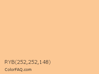 RYB 252,252,148 Color is a light orange color and the nearest color is Peach Orange #ffcc99. Hex code #fcc894 and RGB value is rgb(252,200,148). In RGB color space, this color is composed of 99% red, 78% green, 58% blue, In CMYK color space, this color is composed of 0% cyan, 21% magenta, 41% yellow , 1% black , In HSL color space, this color has a hue angle of 30° , 95% saturation and 78% lightness.