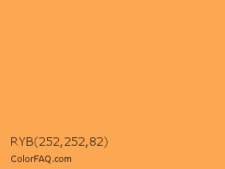 RYB 252,252,82 Color is a light orange color and the nearest color is Tan Hide #fa9d5a. Hex code #fca752 and RGB value is rgb(252,167,82). In RGB color space, this color is composed of 99% red, 65% green, 32% blue, In CMYK color space, this color is composed of 0% cyan, 34% magenta, 67% yellow , 1% black , In HSL color space, this color has a hue angle of 30° , 97% saturation and 65% lightness.