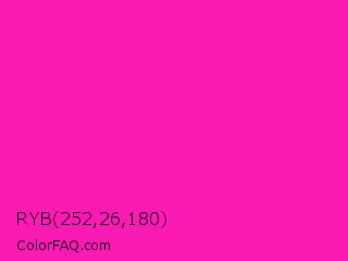 RYB 252,26,180 Color is a normal magenta color and the nearest color is Shocking Pink #fc0fc0. Hex code #fc1ab4 and RGB value is rgb(252,26,180). In RGB color space, this color is composed of 99% red, 10% green, 71% blue, In CMYK color space, this color is composed of 0% cyan, 90% magenta, 29% yellow , 1% black , In HSL color space, this color has a hue angle of 319° , 97% saturation and 55% lightness.
