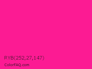 RYB 252,27,147 Color is a normal rose color and the nearest color is Fluorescent Pink #ff1493. Hex code #fc1b93 and RGB value is rgb(252,27,147). In RGB color space, this color is composed of 99% red, 11% green, 58% blue, In CMYK color space, this color is composed of 0% cyan, 89% magenta, 42% yellow , 1% black , In HSL color space, this color has a hue angle of 328° , 97% saturation and 55% lightness.