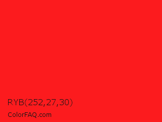 RYB 252,27,30 Color is a normal red color and the nearest color is Vivid Red #f70d1a. Hex code #fc1b1e and RGB value is rgb(252,27,30). In RGB color space, this color is composed of 99% red, 11% green, 12% blue, In CMYK color space, this color is composed of 0% cyan, 89% magenta, 88% yellow , 1% black , In HSL color space, this color has a hue angle of 359° , 97% saturation and 55% lightness.