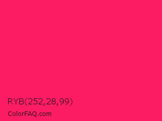 RYB 252,28,99 Color is a normal rose color and the nearest color is Awesome #ff2052. Hex code #fc1c63 and RGB value is rgb(252,28,99). In RGB color space, this color is composed of 99% red, 11% green, 39% blue, In CMYK color space, this color is composed of 0% cyan, 89% magenta, 61% yellow , 1% black , In HSL color space, this color has a hue angle of 341° , 97% saturation and 55% lightness.