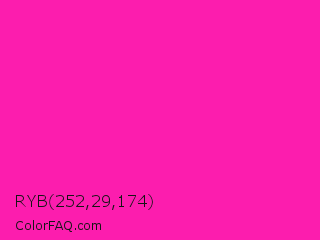 RYB 252,29,174 Color is a normal magenta color and the nearest color is Persian Rose #fe28a2. Hex code #fc1dae and RGB value is rgb(252,29,174). In RGB color space, this color is composed of 99% red, 11% green, 68% blue, In CMYK color space, this color is composed of 0% cyan, 88% magenta, 31% yellow , 1% black , In HSL color space, this color has a hue angle of 321° , 97% saturation and 55% lightness.
