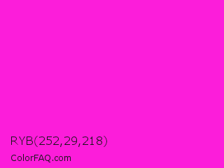 RYB 252,29,218 Color is a normal magenta color and the nearest color is Hot Magenta #ff1dce. Hex code #fc1dda and RGB value is rgb(252,29,218). In RGB color space, this color is composed of 99% red, 11% green, 85% blue, In CMYK color space, this color is composed of 0% cyan, 88% magenta, 13% yellow , 1% black , In HSL color space, this color has a hue angle of 309° , 97% saturation and 55% lightness.