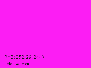 RYB 252,29,244 Color is a normal magenta color and the nearest color is Magenta / Fuchsia #ff00ff. Hex code #fc1df4 and RGB value is rgb(252,29,244). In RGB color space, this color is composed of 99% red, 11% green, 96% blue, In CMYK color space, this color is composed of 0% cyan, 88% magenta, 3% yellow , 1% black , In HSL color space, this color has a hue angle of 302° , 97% saturation and 55% lightness.