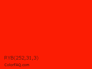 RYB 252,31,3 Color is a normal red color and the nearest color is Scarlet #ff2400. Hex code #fc1c03 and RGB value is rgb(252,28,3). In RGB color space, this color is composed of 99% red, 11% green, 1% blue, In CMYK color space, this color is composed of 0% cyan, 89% magenta, 99% yellow , 1% black , In HSL color space, this color has a hue angle of 6° , 98% saturation and 50% lightness.