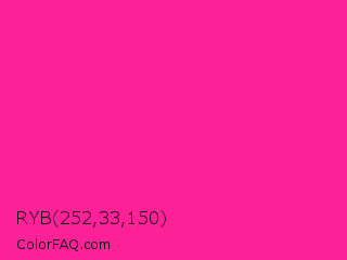 RYB 252,33,150 Color is a normal rose color and the nearest color is Fluorescent Pink #ff1493. Hex code #fc2196 and RGB value is rgb(252,33,150). In RGB color space, this color is composed of 99% red, 13% green, 59% blue, In CMYK color space, this color is composed of 0% cyan, 87% magenta, 40% yellow , 1% black , In HSL color space, this color has a hue angle of 328° , 97% saturation and 56% lightness.