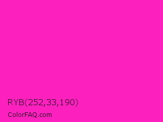 RYB 252,33,190 Color is a normal magenta color and the nearest color is Hot Magenta #ff1dce. Hex code #fc21be and RGB value is rgb(252,33,190). In RGB color space, this color is composed of 99% red, 13% green, 75% blue, In CMYK color space, this color is composed of 0% cyan, 87% magenta, 25% yellow , 1% black , In HSL color space, this color has a hue angle of 317° , 97% saturation and 56% lightness.