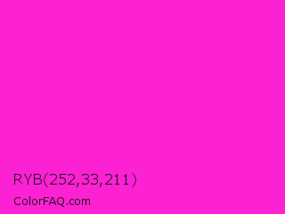 RYB 252,33,211 Color is a normal magenta color and the nearest color is Hot Magenta #ff1dce. Hex code #fc21d3 and RGB value is rgb(252,33,211). In RGB color space, this color is composed of 99% red, 13% green, 83% blue, In CMYK color space, this color is composed of 0% cyan, 87% magenta, 16% yellow , 1% black , In HSL color space, this color has a hue angle of 311° , 97% saturation and 56% lightness.