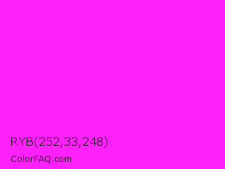 RYB 252,33,248 Color is a normal magenta color and the nearest color is Magenta / Fuchsia #ff00ff. Hex code #fc21f8 and RGB value is rgb(252,33,248). In RGB color space, this color is composed of 99% red, 13% green, 97% blue, In CMYK color space, this color is composed of 0% cyan, 87% magenta, 2% yellow , 1% black , In HSL color space, this color has a hue angle of 301° , 97% saturation and 56% lightness.