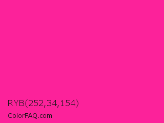 RYB 252,34,154 Color is a normal magenta color and the nearest color is Persian Rose #fe28a2. Hex code #fc229a and RGB value is rgb(252,34,154). In RGB color space, this color is composed of 99% red, 13% green, 60% blue, In CMYK color space, this color is composed of 0% cyan, 87% magenta, 39% yellow , 1% black , In HSL color space, this color has a hue angle of 327° , 97% saturation and 56% lightness.