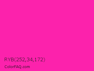 RYB 252,34,172 Color is a normal magenta color and the nearest color is Persian Rose #fe28a2. Hex code #fc22ac and RGB value is rgb(252,34,172). In RGB color space, this color is composed of 99% red, 13% green, 67% blue, In CMYK color space, this color is composed of 0% cyan, 87% magenta, 32% yellow , 1% black , In HSL color space, this color has a hue angle of 322° , 97% saturation and 56% lightness.