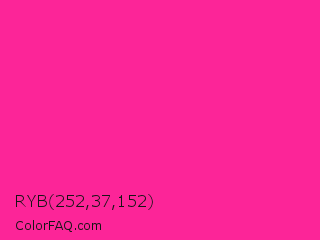 RYB 252,37,152 Color is a normal rose color and the nearest color is Persian Rose #fe28a2. Hex code #fc2598 and RGB value is rgb(252,37,152). In RGB color space, this color is composed of 99% red, 15% green, 60% blue, In CMYK color space, this color is composed of 0% cyan, 85% magenta, 40% yellow , 1% black , In HSL color space, this color has a hue angle of 328° , 97% saturation and 57% lightness.