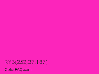 RYB 252,37,187 Color is a normal magenta color and the nearest color is Hot Magenta #ff1dce. Hex code #fc25bb and RGB value is rgb(252,37,187). In RGB color space, this color is composed of 99% red, 15% green, 73% blue, In CMYK color space, this color is composed of 0% cyan, 85% magenta, 26% yellow , 1% black , In HSL color space, this color has a hue angle of 318° , 97% saturation and 57% lightness.