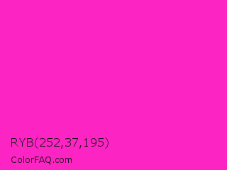 RYB 252,37,195 Color is a normal magenta color and the nearest color is Hot Magenta #ff1dce. Hex code #fc25c3 and RGB value is rgb(252,37,195). In RGB color space, this color is composed of 99% red, 15% green, 76% blue, In CMYK color space, this color is composed of 0% cyan, 85% magenta, 23% yellow , 1% black , In HSL color space, this color has a hue angle of 316° , 97% saturation and 57% lightness.