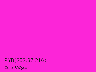 RYB 252,37,216 Color is a normal magenta color and the nearest color is Hot Magenta #ff1dce. Hex code #fc25d8 and RGB value is rgb(252,37,216). In RGB color space, this color is composed of 99% red, 15% green, 85% blue, In CMYK color space, this color is composed of 0% cyan, 85% magenta, 14% yellow , 1% black , In HSL color space, this color has a hue angle of 310° , 97% saturation and 57% lightness.