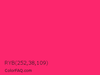 RYB 252,38,109 Color is a normal rose color and the nearest color is Radical Red #ff355e. Hex code #fc266d and RGB value is rgb(252,38,109). In RGB color space, this color is composed of 99% red, 15% green, 43% blue, In CMYK color space, this color is composed of 0% cyan, 85% magenta, 57% yellow , 1% black , In HSL color space, this color has a hue angle of 340° , 97% saturation and 57% lightness.