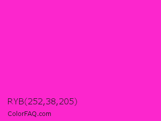 RYB 252,38,205 Color is a normal magenta color and the nearest color is Hot Magenta #ff1dce. Hex code #fc26cd and RGB value is rgb(252,38,205). In RGB color space, this color is composed of 99% red, 15% green, 80% blue, In CMYK color space, this color is composed of 0% cyan, 85% magenta, 19% yellow , 1% black , In HSL color space, this color has a hue angle of 313° , 97% saturation and 57% lightness.
