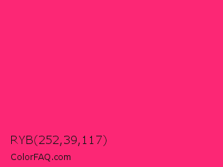 RYB 252,39,117 Color is a normal rose color and the nearest color is Razzmatazz #e3256b. Hex code #fc2775 and RGB value is rgb(252,39,117). In RGB color space, this color is composed of 99% red, 15% green, 46% blue, In CMYK color space, this color is composed of 0% cyan, 85% magenta, 54% yellow , 1% black , In HSL color space, this color has a hue angle of 338° , 97% saturation and 57% lightness.