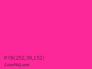 RYB 252,39,152 Color is a normal rose color and the nearest color is Persian Rose #fe28a2. Hex code #fc2798 and RGB value is rgb(252,39,152). In RGB color space, this color is composed of 99% red, 15% green, 60% blue, In CMYK color space, this color is composed of 0% cyan, 85% magenta, 40% yellow , 1% black , In HSL color space, this color has a hue angle of 328° , 97% saturation and 57% lightness.