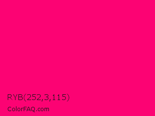 RYB 252,3,115 Color is a normal rose color and the nearest color is Vivid Raspberry #ff006c. Hex code #fc0373 and RGB value is rgb(252,3,115). In RGB color space, this color is composed of 99% red, 1% green, 45% blue, In CMYK color space, this color is composed of 0% cyan, 99% magenta, 54% yellow , 1% black , In HSL color space, this color has a hue angle of 333° , 98% saturation and 50% lightness.
