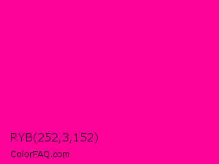 RYB 252,3,152 Color is a normal magenta color and the nearest color is Magenta Process #ff0090. Hex code #fc0398 and RGB value is rgb(252,3,152). In RGB color space, this color is composed of 99% red, 1% green, 60% blue, In CMYK color space, this color is composed of 0% cyan, 99% magenta, 40% yellow , 1% black , In HSL color space, this color has a hue angle of 324° , 98% saturation and 50% lightness.