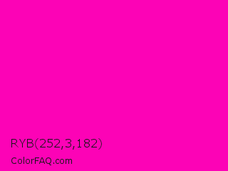 RYB 252,3,182 Color is a normal magenta color and the nearest color is Shocking Pink #fc0fc0. Hex code #fc03b6 and RGB value is rgb(252,3,182). In RGB color space, this color is composed of 99% red, 1% green, 71% blue, In CMYK color space, this color is composed of 0% cyan, 99% magenta, 28% yellow , 1% black , In HSL color space, this color has a hue angle of 317° , 98% saturation and 50% lightness.