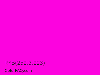 RYB 252,3,223 Color is a normal magenta color and the nearest color is Purple Pizzazz #ff00cc. Hex code #fc03df and RGB value is rgb(252,3,223). In RGB color space, this color is composed of 99% red, 1% green, 87% blue, In CMYK color space, this color is composed of 0% cyan, 99% magenta, 12% yellow , 1% black , In HSL color space, this color has a hue angle of 307° , 98% saturation and 50% lightness.