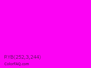 RYB 252,3,244 Color is a normal magenta color and the nearest color is Magenta / Fuchsia #ff00ff. Hex code #fc03f4 and RGB value is rgb(252,3,244). In RGB color space, this color is composed of 99% red, 1% green, 96% blue, In CMYK color space, this color is composed of 0% cyan, 99% magenta, 3% yellow , 1% black , In HSL color space, this color has a hue angle of 302° , 98% saturation and 50% lightness.