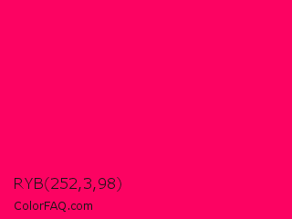 RYB 252,3,98 Color is a normal rose color and the nearest color is Vivid Raspberry #ff006c. Hex code #fc0362 and RGB value is rgb(252,3,98). In RGB color space, this color is composed of 99% red, 1% green, 38% blue, In CMYK color space, this color is composed of 0% cyan, 99% magenta, 61% yellow , 1% black , In HSL color space, this color has a hue angle of 337° , 98% saturation and 50% lightness.