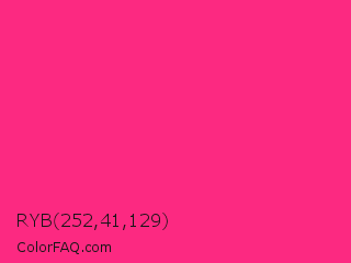 RYB 252,41,129 Color is a normal rose color and the nearest color is Cerise Pink #ec3b83. Hex code #fc2981 and RGB value is rgb(252,41,129). In RGB color space, this color is composed of 99% red, 16% green, 51% blue, In CMYK color space, this color is composed of 0% cyan, 84% magenta, 49% yellow , 1% black , In HSL color space, this color has a hue angle of 335° , 97% saturation and 57% lightness.