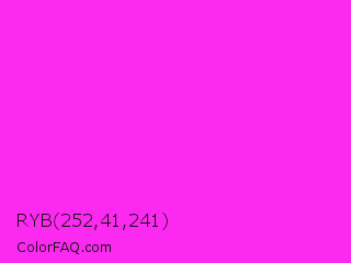 RYB 252,41,241 Color is a normal magenta color and the nearest color is Hot Magenta #ff1dce. Hex code #fc29f1 and RGB value is rgb(252,41,241). In RGB color space, this color is composed of 99% red, 16% green, 95% blue, In CMYK color space, this color is composed of 0% cyan, 84% magenta, 4% yellow , 1% black , In HSL color space, this color has a hue angle of 303° , 97% saturation and 57% lightness.